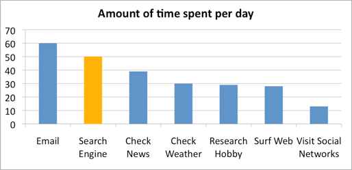 最近的调查结果从另一个皮尤因特网与美国生活的跟踪调查显示,大约有一半的用户现在使用的所有互联网搜索引擎上典型的一天一个。 搜索引擎使用芽边在过去的一年,对申请的电子邮件作为主要的互联网。