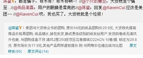 5月4日,据某用户在微博中投诉,他在美团网购买的卷纸无清风外包装,并且还有虚标提价之嫌,与团购信息不符。
