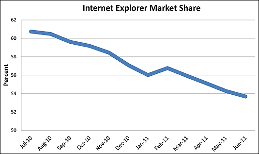 六月份的数字显示,和互联网市场跟踪公司Net Applications的显示又在IE的市场份额大幅度下降全世界,以60.32%与去年六月的53.68%,同比下降约7个百分点。
